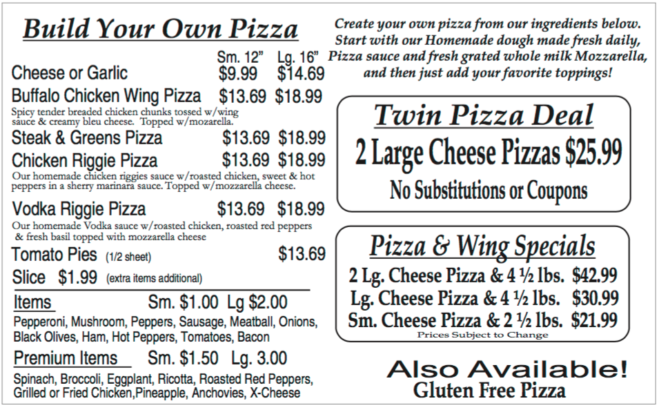 They don't call us Charlie's Pizza for nothing! Our Utica style pizza and tomato pie is second to none. It's all about the recipe...the fresh ingredients we use and the homemade NY style hand tossed dough.